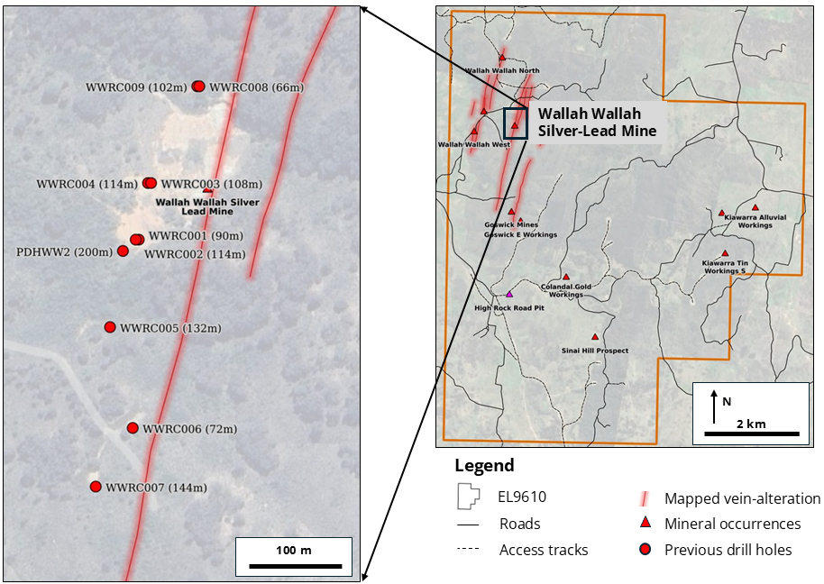 Previous Reverse Circulation (RC) drilling carried out in 2010 by Silver Mines Ltd in JV (2004 – 2016) with Australia Oriental Minerals NL, focused on the historic Walla Walla Silver-Lead Mine. Drilling by Silver Mines Ltd (9 holes for 962m) intersected narrow-vein-style mineralisation up to 2.5m wide over a strike length of 350m. Mineralisation remains open to the north, south, and down-dip.